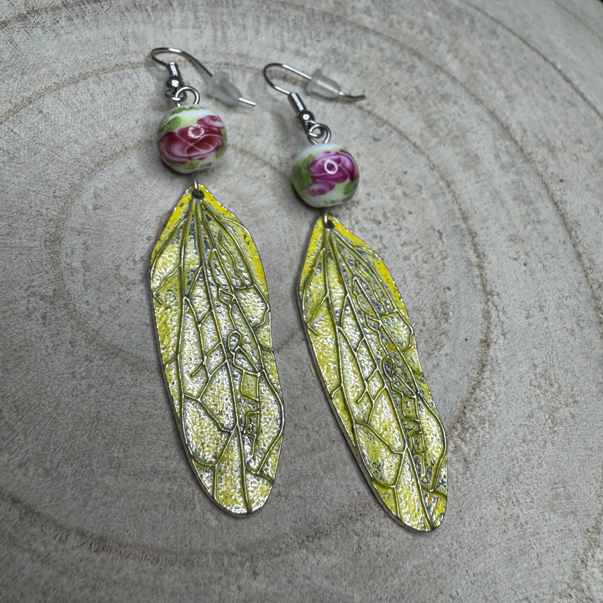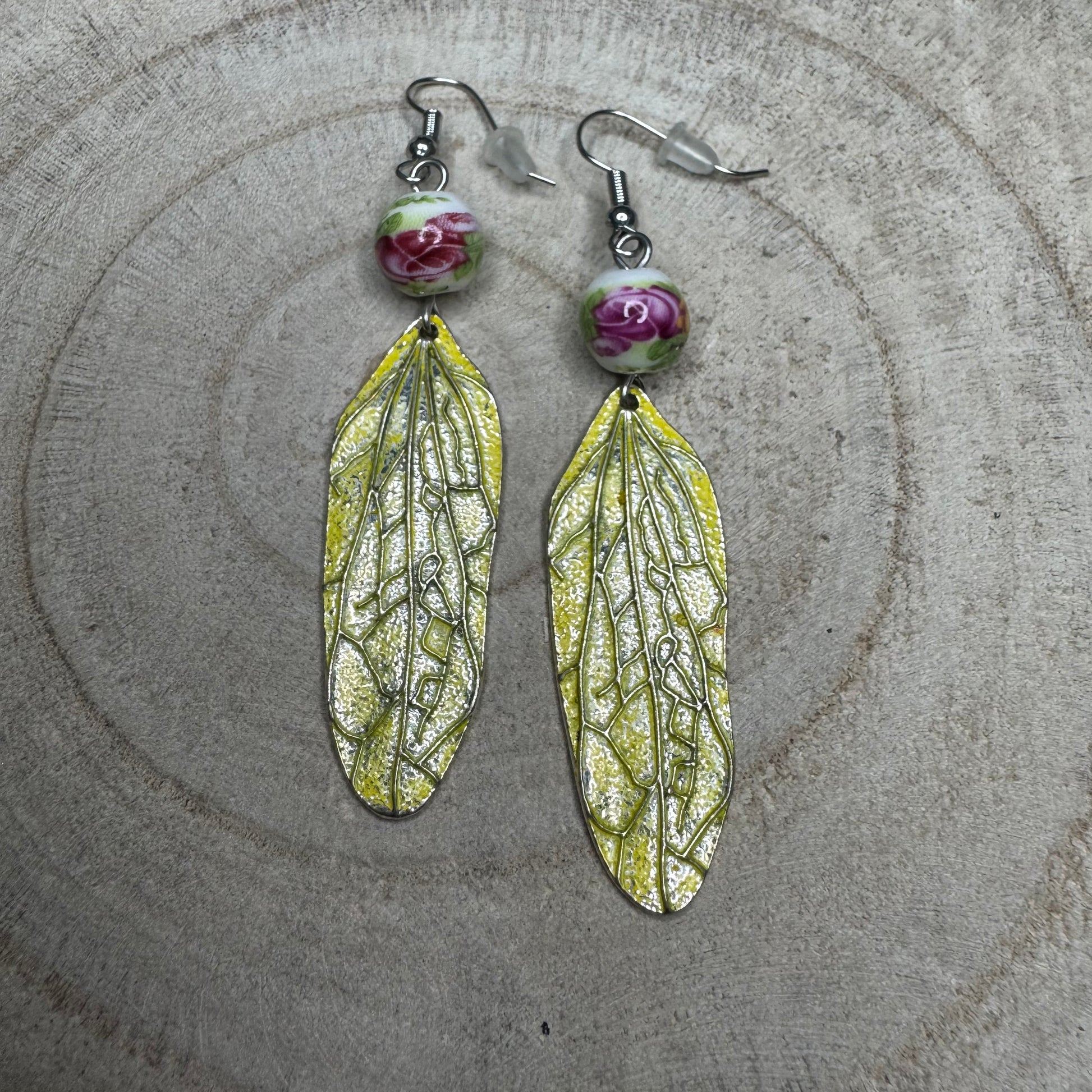 Brincos Folha Comprida Amarela com Conta Pintada