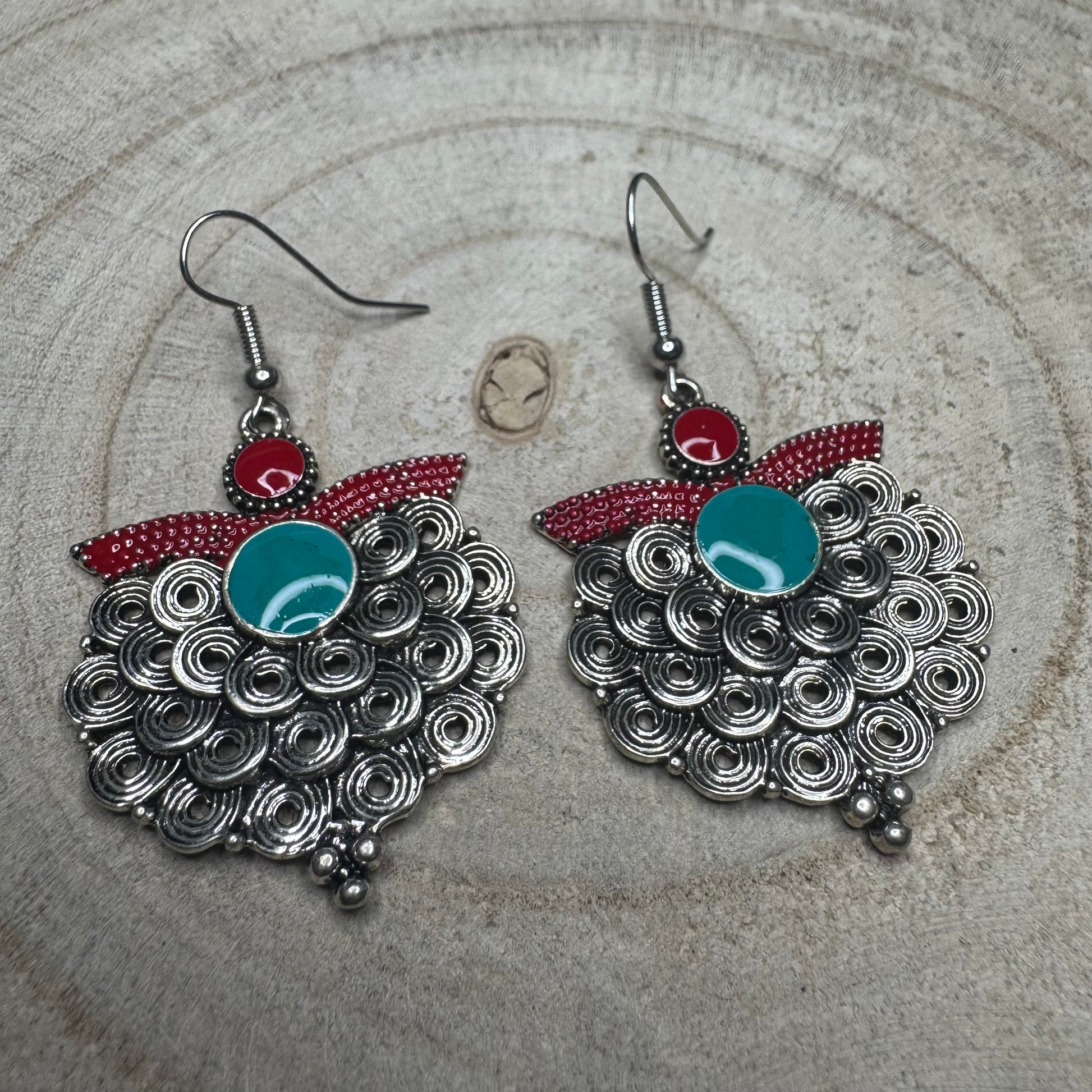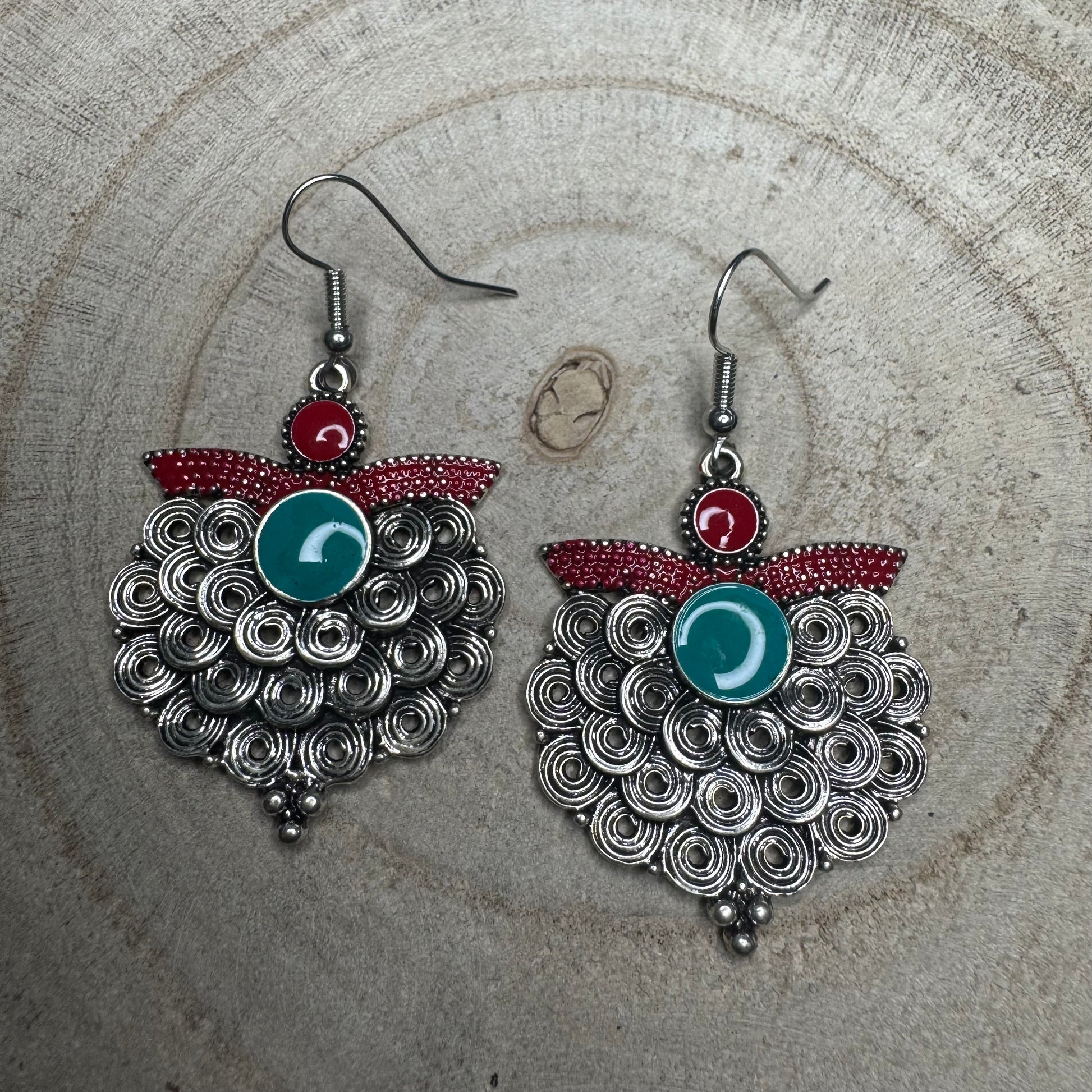 Brincos Rústicos Caracolinhos com Verde e Vermelho Prateado