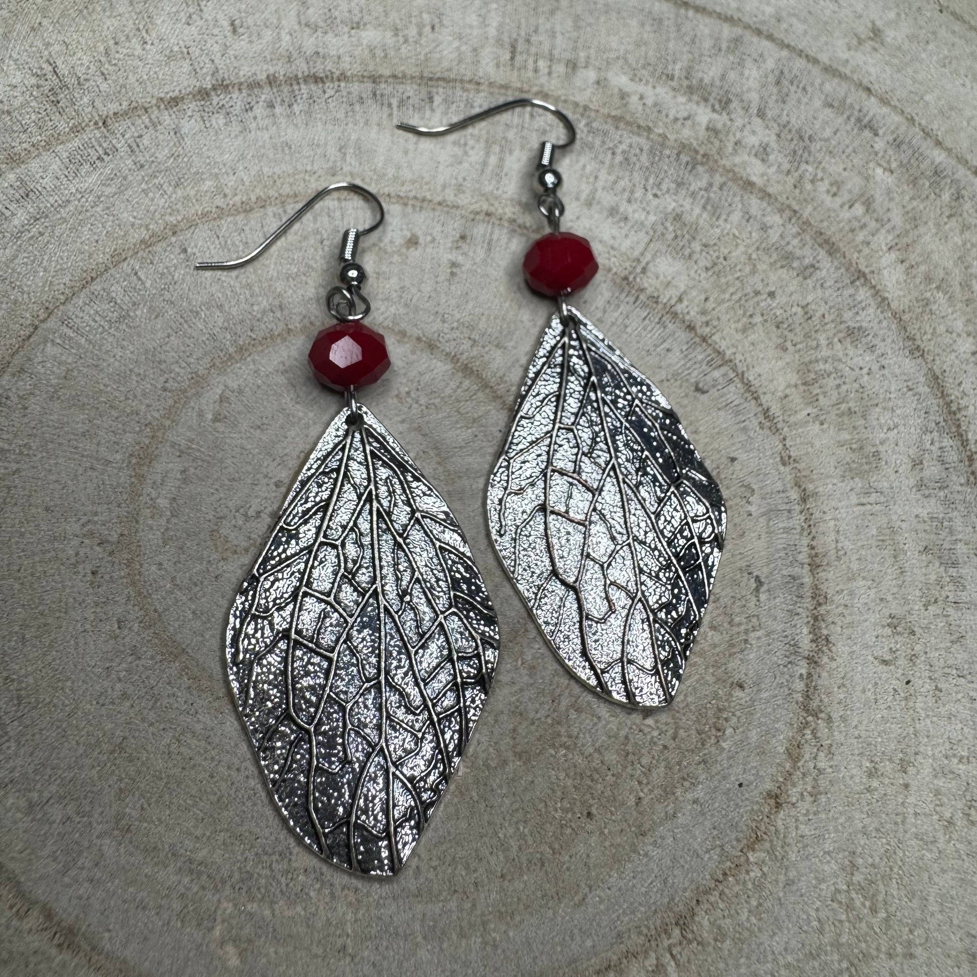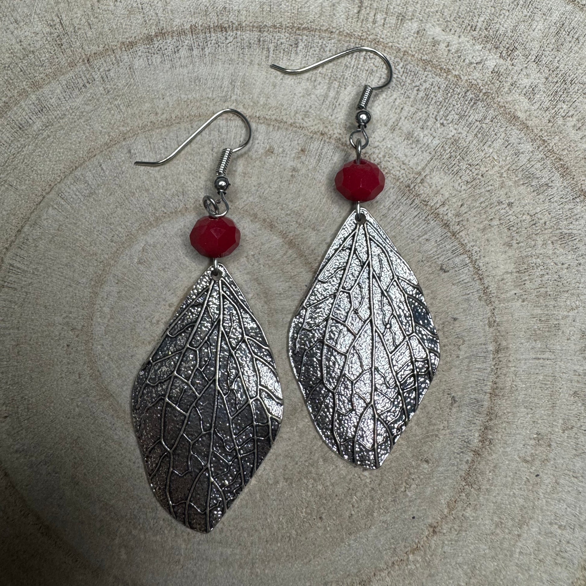 Brincos Rústicos Folha Prata com Missanga Encarnada