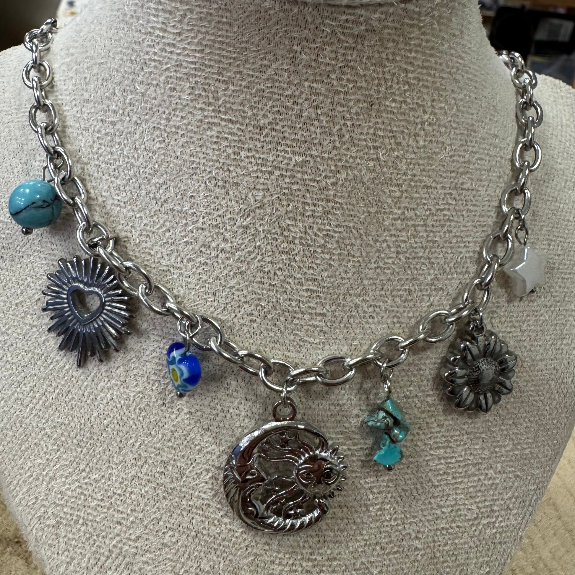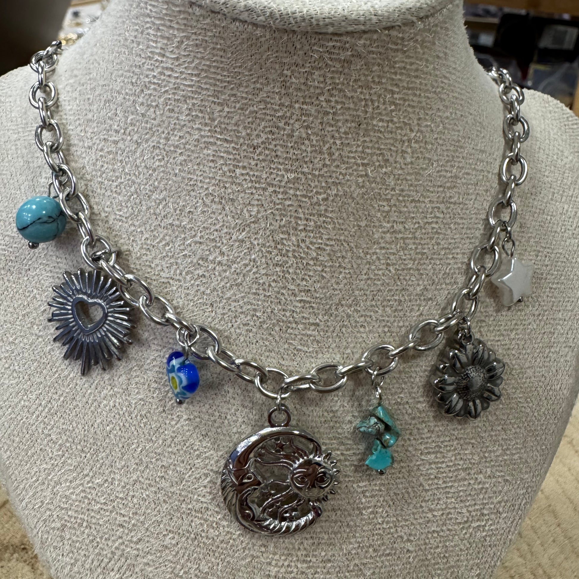 Fio Grosso Aço com Pendentes Prateados e Azuis