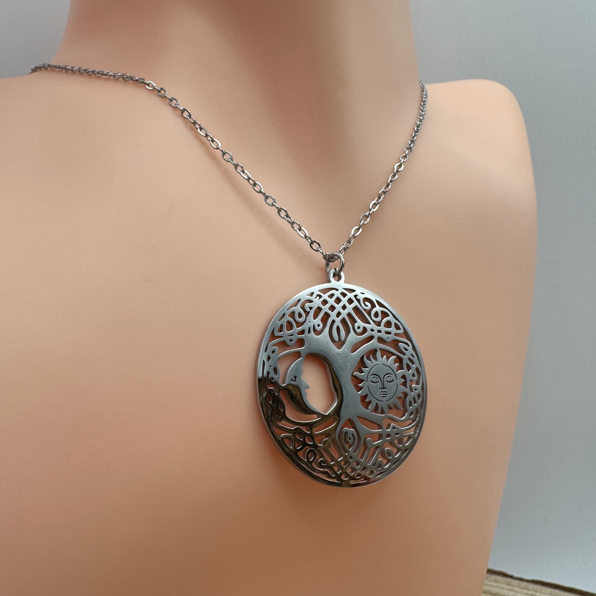 Fio Medalha Grande com Árvore, Sol e Lua Prateado